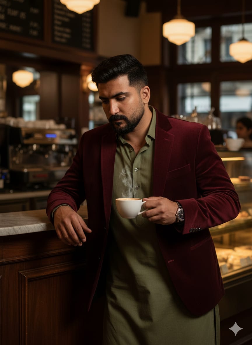 A captivating half-body portrait (exact face retention required) of a man dressed in a soft olive shalwar kameez and a dark ruby-red velvet blazer. He is positioned leaning effortlessly against a high, polished wooden counter inside a classic Parisian-style café. Pose involves one hand gripping the counter edge, the other gently holding a steaming coffee mug, eyes focused downward in thought. Warm ambient lighting, deep cinematic shadow play, shallow depth of field, fashion magazine aesthetic.