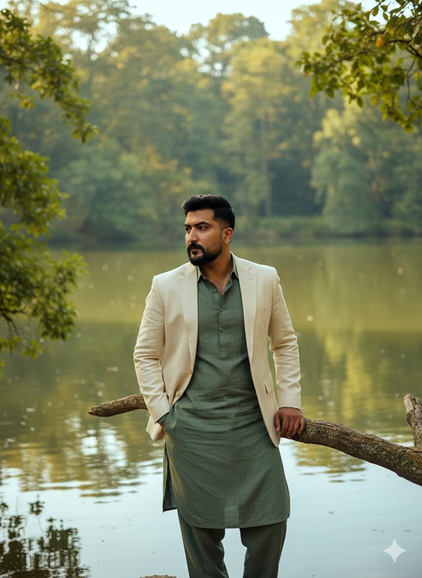 Stunning full-body fashion shot (match reference face perfectly) of a man in a muted forest-green shalwar ensemble layered with a crisp cream-colored linen blazer. He stands composed near a calm lakeside, where soft water reflections play behind him, framed by dense leafy trees. Pose is relaxed and contemplative, one hand casually in the trousers pocket, the other resting on a low tree branch. Soft focus sunlight with noticeable background bokeh, cinematic color grading, 4K.