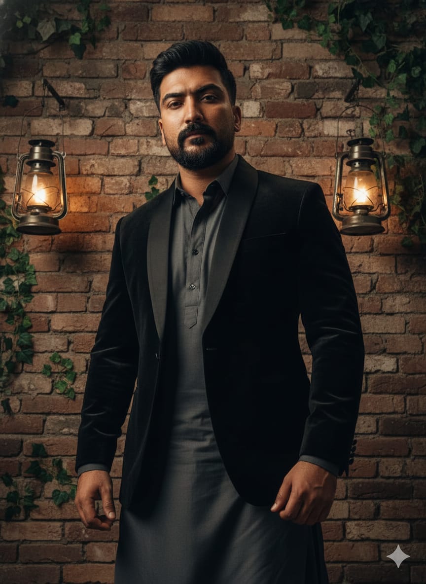 Highly stylized mid-shot portrait (guarantee reference face match) featuring a strong stance. The subject wears a luxurious charcoal shalwar kameez under a tailored black velvet jacket, positioned against an aged, textured brick wall illuminated by vintage-style lanterns. The illumination is ‘Golden Hour’ inspired, casting deep, warm shadows and high contrast on the facial contours. Low-angle framing emphasizes dominance. Editorial quality, dramatic depth of field, high-detail.