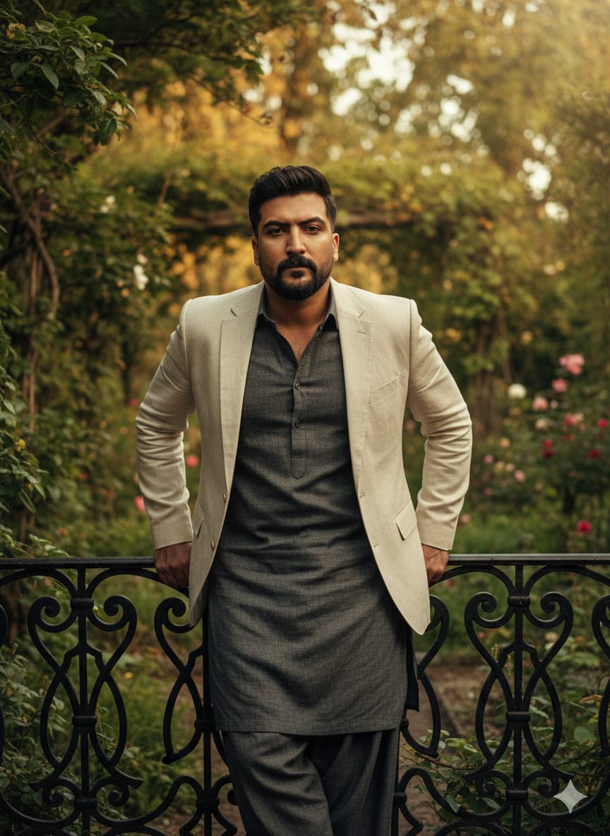 A powerful fusion fashion portrait. A self-assured man in a dark grey shalwar suit contrasted with a light bone-colored blazer. He leans comfortably on a black ornamental iron garden railing, surrounded by the lush, rustic greenery typical of European estates. Golden sunlight creates a moody atmospheric glow, highlighting the textile textures. Vertical magazine layout, realistic 4K cinematic tone.