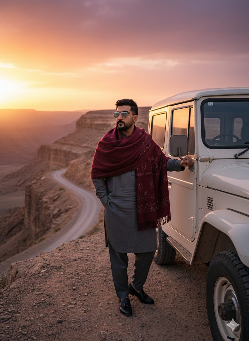 A cinematic ‘Desert Edge’ portrait. A 23-year-old confident man is standing next to a pearl-white vintage SUV (Land Cruiser style) on a dramatic cliffside road. He wears a charcoal shalwar kameez, accessorized with a deep patterned burgundy shawl and black loafers. Aviator glasses reflect the fiery orange twilight sky. Pose is casual, hand in pocket, gazing towards the horizon. Dust motes visible in the air, creating a luxury desert fashion editorial atmosphere. (8K HDR | Cinematic Quality | Cliffside Scene).