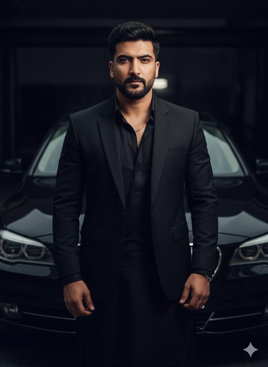 Hyper-detailed, stylized 4K portrait of the same sharp-featured model (flawless skin and face preservation required) in a perfectly fitted, minimalist all-black shalwar suit. The suit is subtly unbuttoned at the top to reveal a delicate gold chain. He stands confidently against a softly focused, luxury black sedan background (BMW style). Symmetrical composition, editorial lighting highlighting high contrast, 9:16 aspect ratio.