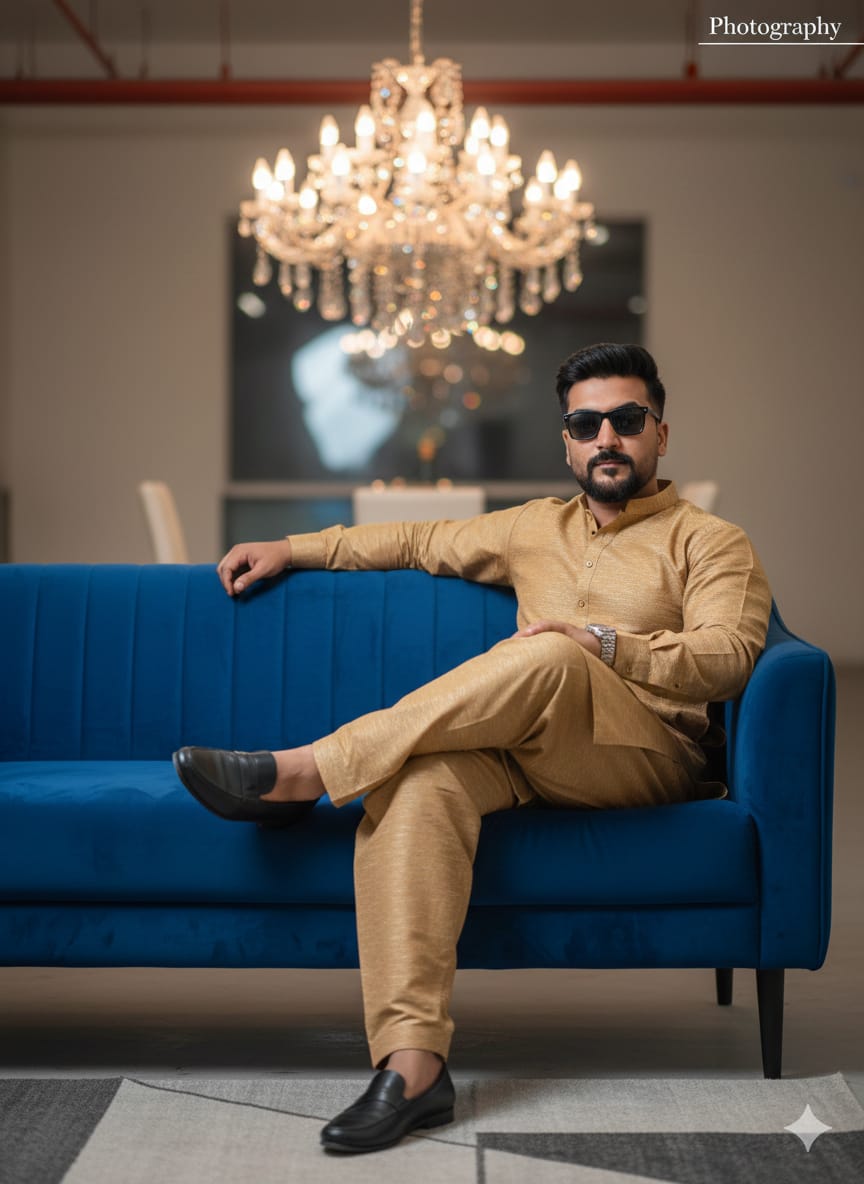 8K Ultra-realistic, high-fashion studio editorial. A young man (same reference face) is lounging casually on a rich sapphire blue velvet sofa within a high-end modern studio space. Outfit: A sophisticated golden-hued shalwar kameez paired with classic shoes and sleek black sunglasses. Soft ambient light, background featuring a blurred opulent chandelier glow. Incorporate a subtle, unobtrusive ‘Photography’ watermark in the upper right corner. Elegant and classy tone.
