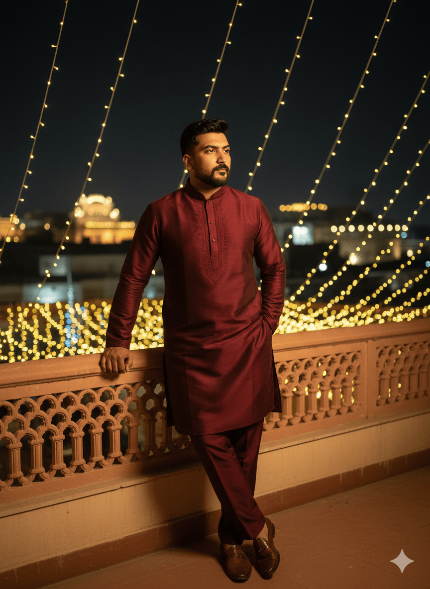 Hyper-realistic, full-body fashion portrait set at night. Confident and relaxed pose. Focus: Festive Rooftop Scene with Jaipur Vibes. The model wears a sophisticated deep maroon shalwar kameez with subtle embroidery detailing. Pose: Standing casually on the edge of a rooftop terrace. Background is softly blurred with warm, glowing string lights and city view. Face match is 100% accurate. Cinematic night setting.