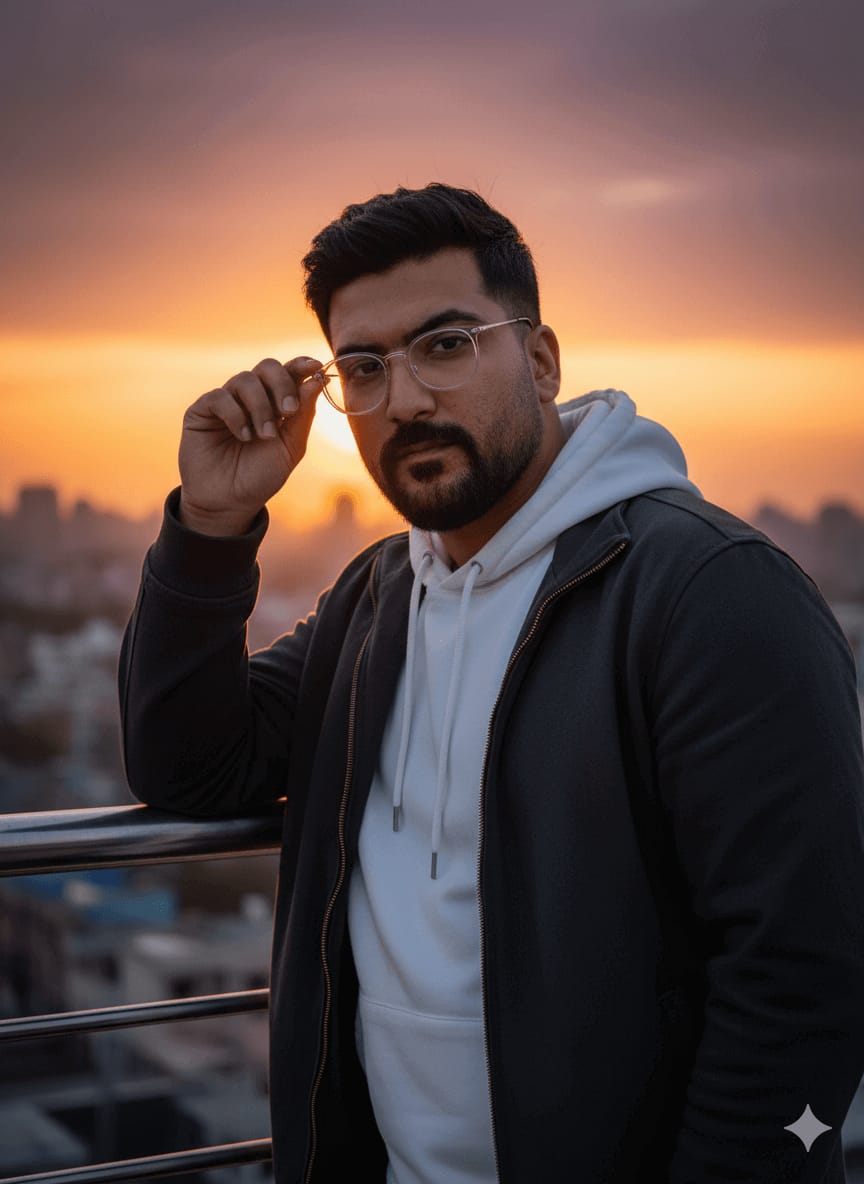 Cinematic Masterpiece, Ultra-Sharp Portrait, Highest Quality, 4K UHD RAW Photo. A confident man (maintain exact face) leaning on a rooftop railing at sunset. He is wearing a clean white streetwear hoodie and zipper jacket. Pose: Relaxed attitude, adjusting clear frame glasses. Background: Out-of-focus urban skyline, deep orange-purple glow of Golden Hour, dramatic rim lighting on the subject. Focus Sharp on Face, Photorealistic Skin Texture, Intricate Fabric Detail, no compression. [Use uploaded image as 100% face reference] –ar 9:16 –style raw –no blurry, lowres, soft edges, noise, watermark, compression artifacts, amateur