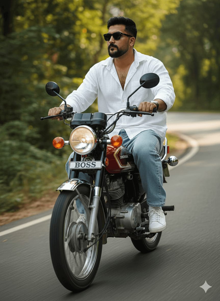 Cinematic Masterpiece, Ultra-Sharp Portrait, Highest Quality, 4K UHD RAW Photo. A man (maintain exact face) riding a Honda CG125 motorcycle, glancing confidently to the side, hands on handlebars. Outfit: Oversized white linen shirt with top buttons open, light blue baggy jeans, white sneakers, and modern sleek sunglasses. Background: Natural outdoor riding environment with motorcycle in motion, number plate ‘BOSS’. Focus Sharp on Face, Perfect Fabric Texture, Detailed Motorcycle, no compression. [Use uploaded image as 100% face reference] –ar 9:16 –style raw –no blurry, low quality, warped, distorted, jpeg artifacts, amateur photo, bad perspective, soft focus