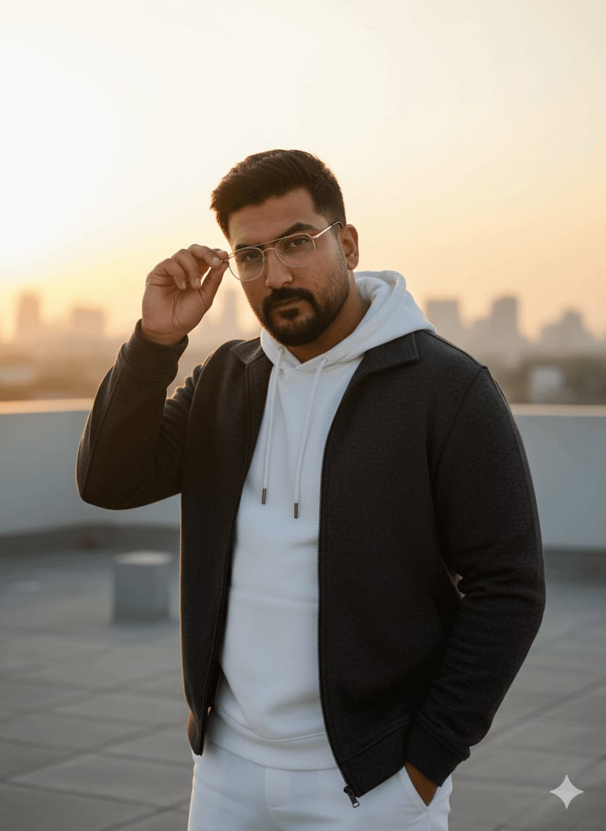 Cinematic Masterpiece, Ultra-Sharp Portrait, Highest Quality, 4K UHD RAW Photo. A stylish man (maintain exact face) in a modern fashion stance, standing slightly angled with one hand adjusting clear frame glasses and the other hand in his pocket. Outfit: Clean white streetwear fit (hoodie under a jacket). Background: Minimal urban rooftop at sunset with warm golden-hour glow, subtle rim light, shallow depth of field. Focus Sharp on Face, Photorealistic Skin Texture, Detailed Fabric Texture, no compression. [Use uploaded image as 100% face reference] –ar 9:16 –style raw –no low quality, jpeg artifacts, blurry, bad anatomy, deformed, signature, text, writing, fuzzy, lack of details
