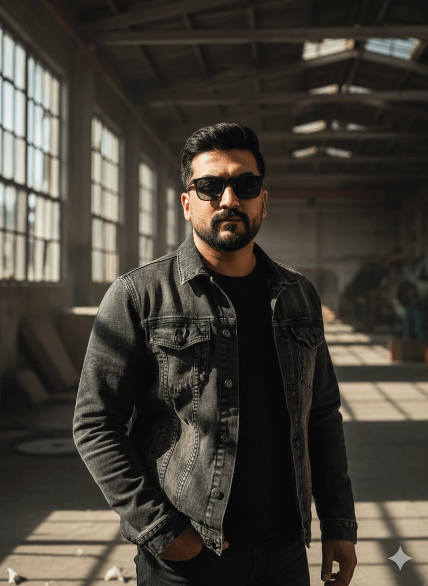 Cinematic Masterpiece, Ultra-Sharp Portrait, Highest Quality, 4K UHD RAW Photo. A serious-looking man (maintain exact face) standing in an abandoned industrial warehouse with large grimy windows. Outfit: Dark sunglasses, black T-shirt, and a dark denim jacket. Pose: One hand in the jeans pocket, looking directly at the camera. Lighting: Dramatic, hard sunlight streaming through the windows, creating harsh shadows and deep contrast, moody cinematic tone. Focus Sharp on Subject, Perfect Denim Texture, Intricate Details, no compression. [Use uploaded image as 100% face reference] –ar 9:16 –style raw –no low resolution, amateur, cartoon, noise, grain, ugly, disfigured, missing limbs, watermark, fuzzy, poor details