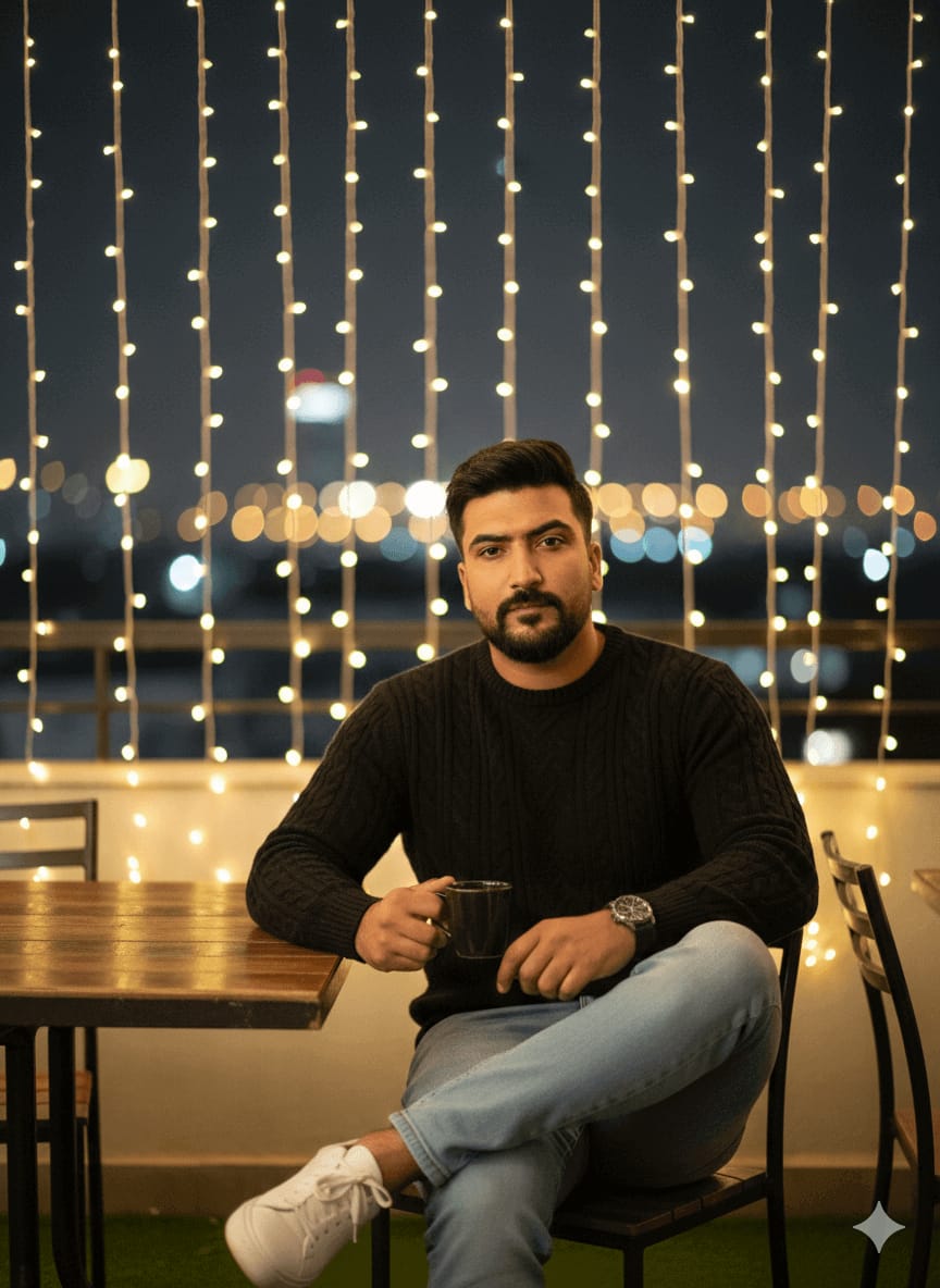 Cinematic Masterpiece, Ultra-Sharp Portrait, Highest Quality, 4K UHD RAW Photo. A stylish man (maintain exact face) sitting cross-legged at an outdoor rooftop café table at night. Outfit: Black cable-knit sweater, light wash blue jeans, white sneakers. Background: Warm, soft glow of string lights (bokeh effect), blurred city lights in the distance. Focus Sharp on Face, Perfect Fabric Texture, Detailed Reflections, no compression. [Use uploaded image as 100% face reference] –ar 9:16 –style raw –no bad quality, blurry, poor quality, bad composition, mutation, extra fingers, low contrast, soft focus