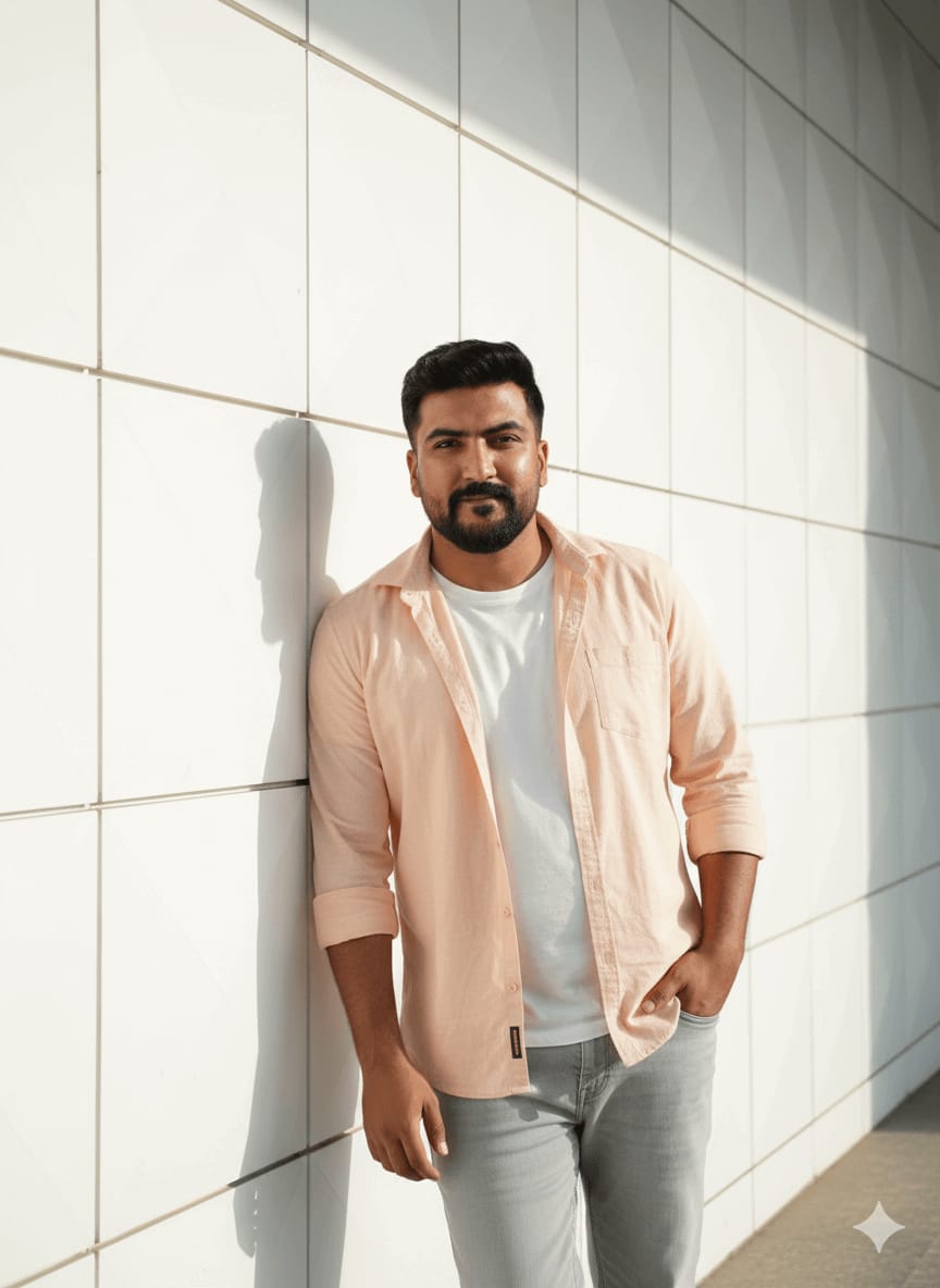 Cinematic Masterpiece, Ultra-Sharp Portrait, Highest Quality, 4K UHD RAW Photo. A stylish man (maintain exact face) leaning against a bright, modern white geometric wall. Outfit: Light peach open button-down shirt over a white T-shirt, light grey jeans. Pose: Casual, relaxed lean, confident half-smile. Lighting: Natural, clean daylight, casting sharp shadows. Focus Sharp on Subject, Perfect Fabric Texture, Detailed Concrete Surface, no compression. [Use uploaded image as 100% face reference] –ar 9:16 –style raw –no bad anatomy, lowres, distorted, fused fingers, wrong proportions, messy, low contrast, blurry edges