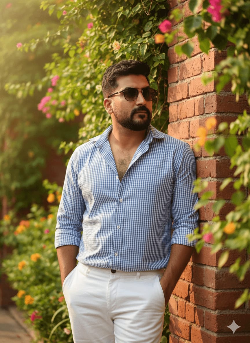 Cinematic Masterpiece, Ultra-Sharp Portrait, Highest Quality, 4K UHD RAW Photo. A striking outdoor portrait of a man (maintain exact face) looking slightly away, leaning against a brick wall with lush greenery. Outfit: Striped shirt (sleeves rolled up), white trousers, and sunglasses. Background: Lush greenery and vibrant flowers, soft and warm cinematic sunlight. Focus Sharp on Face, Perfect Fabric Texture, Detailed Foliage, no compression. [Use uploaded image as 100% face reference] –ar 9:16 –style raw –no noise, pixelated, blurry, low quality, unnatural colors, amateur photo, bad hands, soft focus