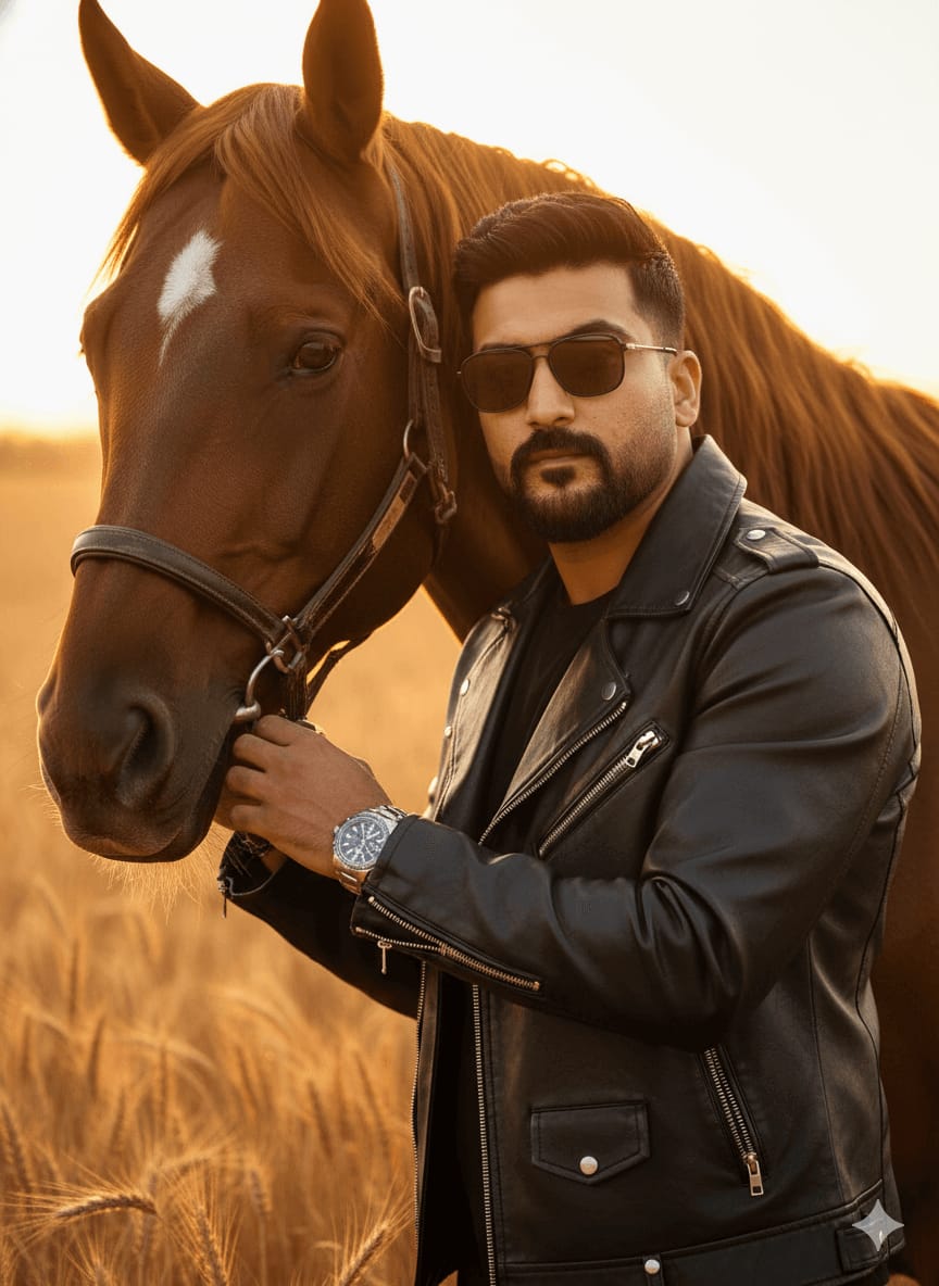 Cinematic Masterpiece, Ultra-Sharp Portrait, Highest Quality, 4K UHD RAW Photo. A stylish man (maintain exact face) standing and gently touching a brown horse in a golden wheat field at sunset. Outfit: Black leather biker jacket, sunglasses, and wristwatch. Pose: Confident, looking directly at the camera. Background: Warm golden sunlight glowing, dramatic rim light, shallow depth of field. Focus Sharp on Subject and Horse’s Eye, Perfect Leather Texture, Detailed Wheat Field, no compression. [Use uploaded image as 100% face reference] –ar 9:16 –style raw –no blurry, poor lighting, low quality, deformed, malformed, cropped, too dark, soft focus