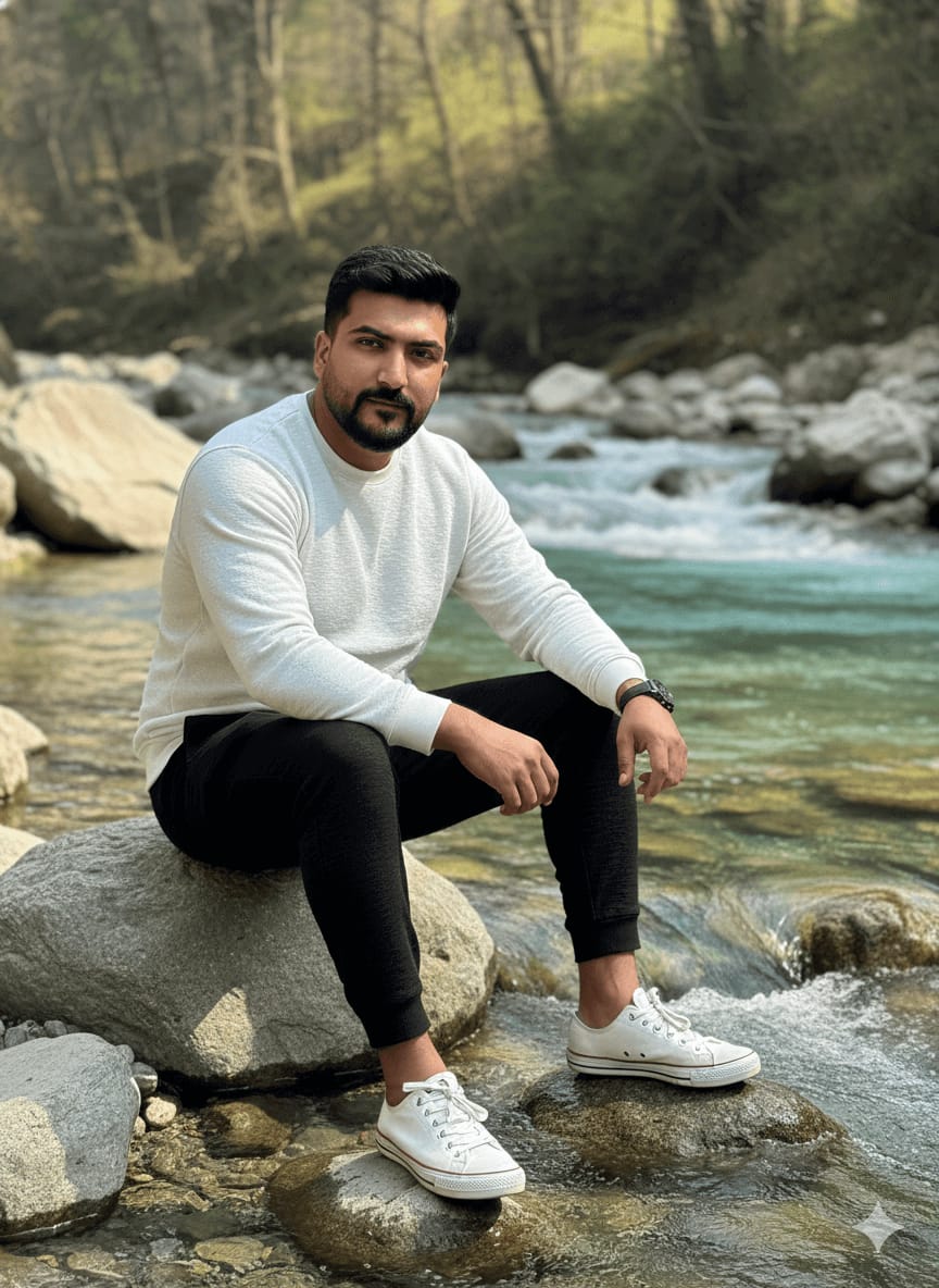 Cinematic Masterpiece, Ultra-Sharp Portrait, Highest Quality, 4K UHD RAW Photo. A man (maintain exact face) sitting casually on large river rocks beside a fast-flowing turquoise river, one hand resting on his shoulder strap. Outfit: Textured white long-sleeve crew-neck sweatshirt, black textured joggers, and classic white lace-up sneakers. Background: Splashing clear water, smooth stones, and soft green trees. Focus Sharp on Face, Perfect Fabric Texture, Detailed Water Effects, no compression. [Use uploaded image as 100% face reference] –ar 9:16 –style raw –no poorly lit, low resolution, ugly, blurry, fused limbs, bad composition, watermark, soft focus