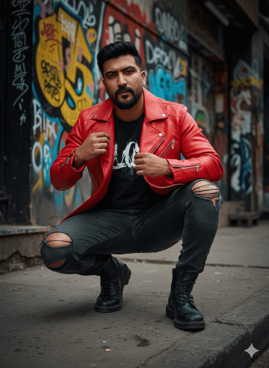 “A 4K, ultra-sharp portrait of a handsome Indian boy (preserve face 100%) wearing a bold red leather jacket over a black graphic tee, paired with ripped dark jeans and black combat boots. He is crouching in front of a vibrant graffiti wall in an Indian metro street, one hand resting on his knee and the other adjusting his jacket collar. Lighting: urban street lighting with strong contrast. Style: tousled hair, confident smirk, and piercing gaze. 8K RAW photo, cinematic composition, Ultra-Fashionable, –ar 9:16.