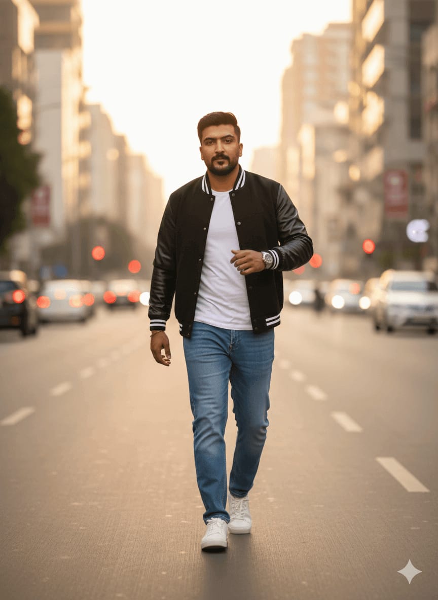 “A 4K ultra-realistic portrait of a handsome Indian man (preserve face 100%) wearing a black varsity jacket, white fitted T-shirt, relaxed denim jeans, and clean white sneakers. He is walking confidently on a modern Indian street with auto lights and warm city glow in the background. Lighting: soft golden hour lighting and crisp shadows. Include subtle motion blur for dynamic movement. 8K RAW Photo, Urban-Fashion Instagram Ready, –ar 9:16.