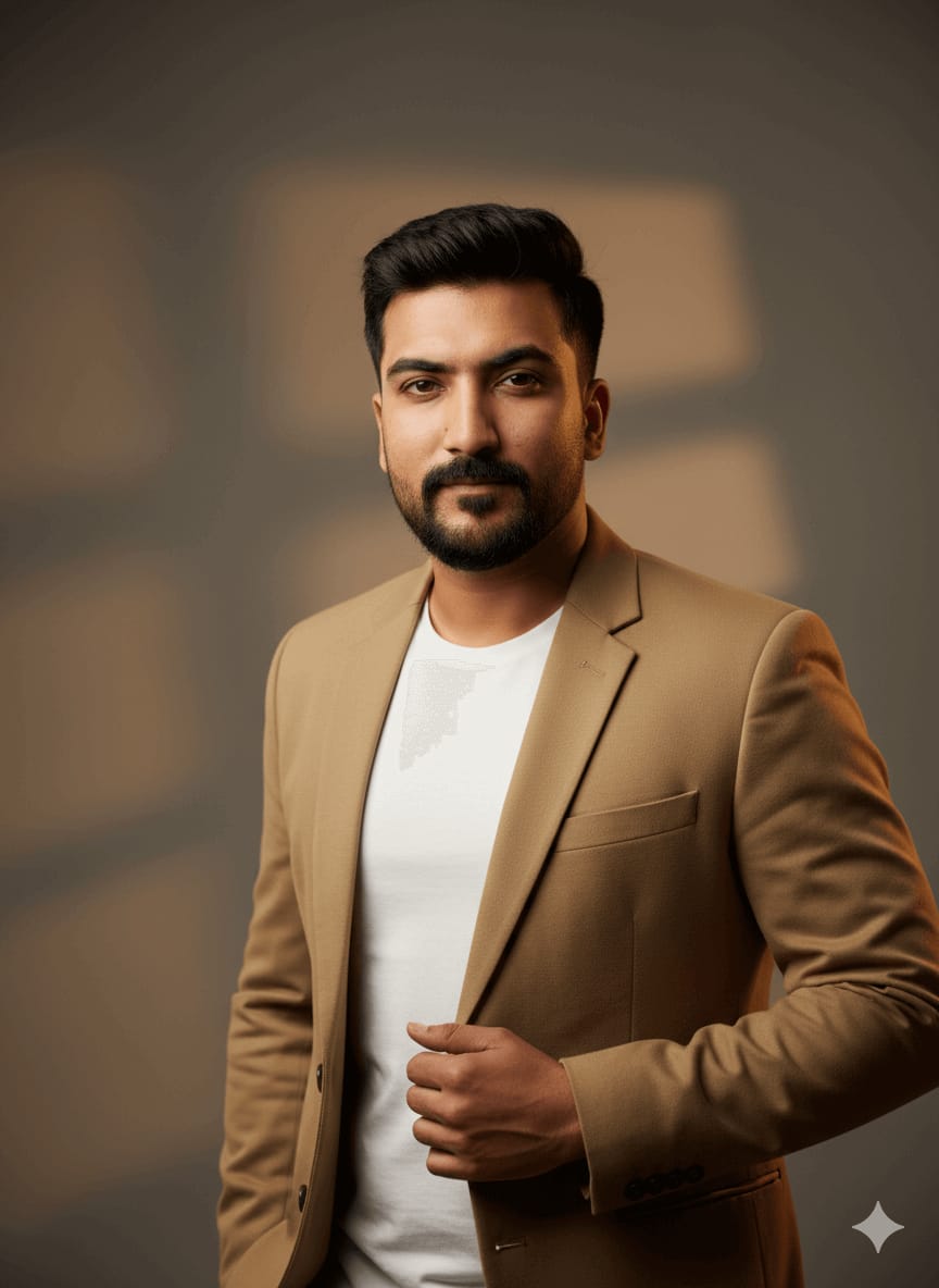 “An ultra-sharp, high-detail portrait of an Indian man (24 years old, preserve face 100%) wearing a tan blazer layered over a white tee, adjusting the lapel with one hand. Lighting: modern indoor studio lighting, warm tones. Style: classy, smart stylish vibe. 4K, Professional Editorial, –ar 9:16.