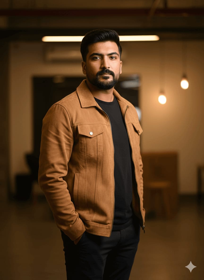 “A clean, crisp 4K editorial portrait of a young Indian man (23 years old, preserve face 100%) wearing a tan suede jacket with dark tailored trousers, one hand casually in his pocket. Lighting: modern indoor lighting, warm tones. Style: smart stylish mood. Ultra-Sharp Focus, Shallow Depth of Field, –ar 9:16.