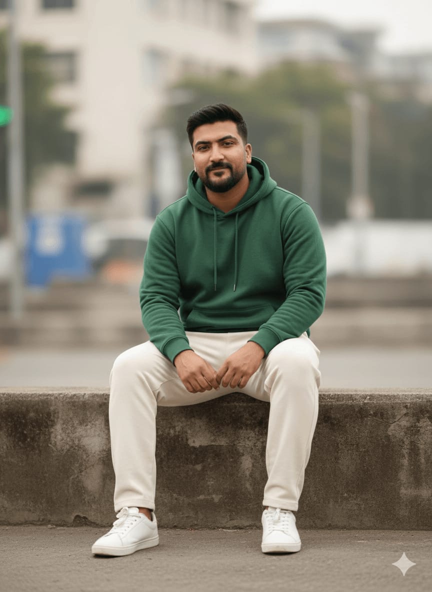 “A 4K HD portrait of an Indian man (21 years old, preserve face 100%) wearing a forest-green hoodie with cream joggers, sitting casually on a low cement wall. Lighting: soft cloudy lighting, relaxed street-style expression. Style: youthful stylish mood. High-Detail Street Photography, –ar 9:16.