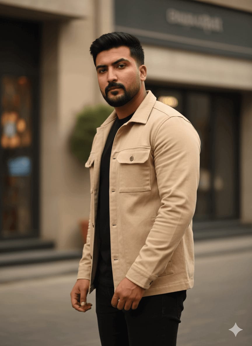 “A sharp 4K portrait of a 23-year-old Indian man (preserve face 100%) in a sand-beige utility jacket over a minimal tee, black jeans, standing turned slightly sideways with a sharp side-glance. Lighting: cinematic warm tones, slight shadow contrast. Style: stylish modern Indian street look. Ultra-Sharp Focus, Editorial Look, –ar 9:16.