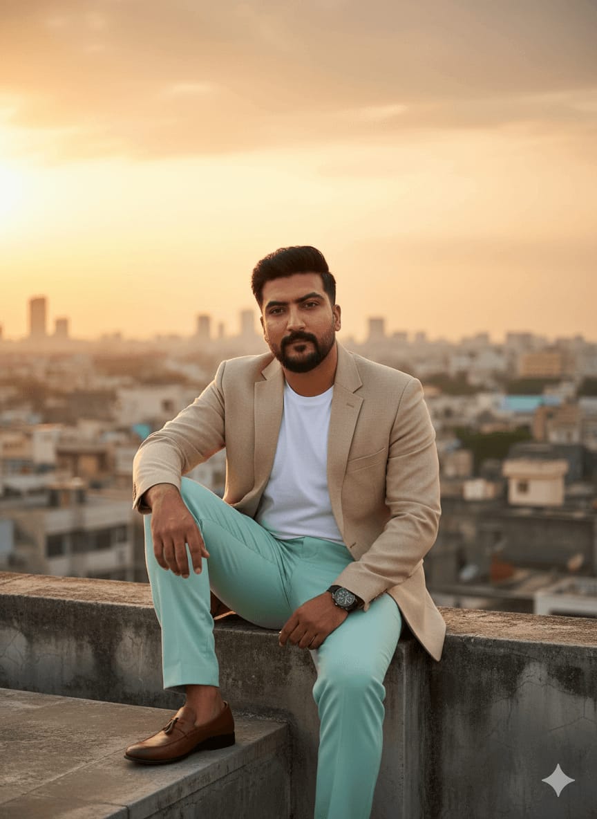 “A 4K ultra-HD, high-detail portrait of a stylish adult Indian man (preserve face 100%) wearing a beige linen blazer over a white T-shirt, slim-fit pastel pants, and brown loafers. He is sitting cross-legged on a rooftop ledge with the city skyline and warm sunset glow behind. Lighting: soft cinematic shadows and golden rim light. Style: confident yet relaxed posture, subtle smile, and neatly styled hair. Ultra-Sharp Focus, Smooth Skin Texture, Modern Urban Vibe, –ar 9:16.