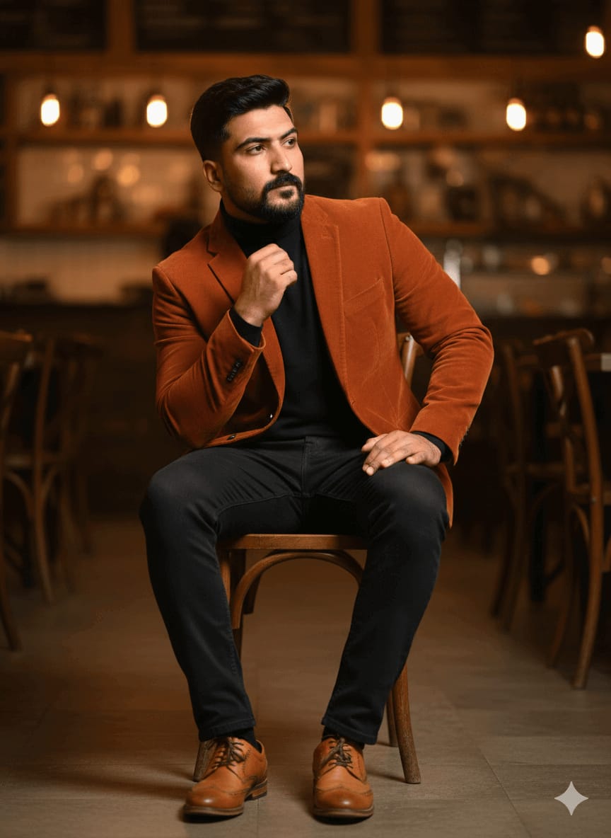 “A 4K, crisp portrait of a smart-looking Indian boy (preserve face 100%) wearing a rust-orange corduroy jacket over a black turtleneck, dark slim jeans, and tan brogues. He is sitting on a vintage café chair with blurred warm lighting and rustic interior behind. Lighting: cozy ambient light highlighting outfit textures. Pose: relaxed side-glance, hand resting on chin, and neatly styled hair. Professional Portrait, Elegant Urban Vibe, Shallow Depth of Field, –ar 9:16.