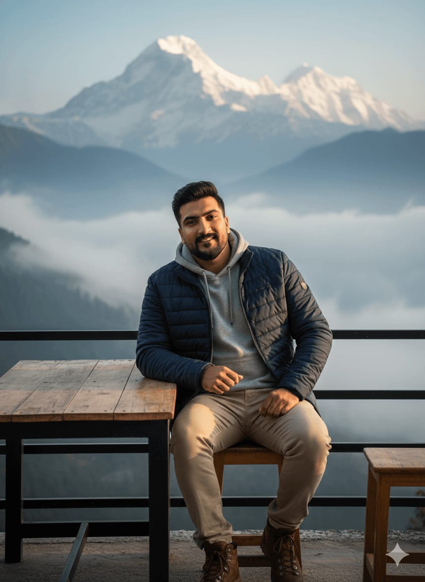 “A 4K portrait of a smart-looking Indian boy (preserve face 100%) wearing a navy quilted jacket over a grey hoodie, beige chinos, and brown boots. He is sitting casually on a mountain café terrace with snow-capped peaks and morning fog behind. Lighting: natural scenic lighting highlighting outfit textures. Pose: playful smile, hands resting on the table, and messy hair. High-Detail, Adventurous Fashionable Vibe, –ar 9:16.