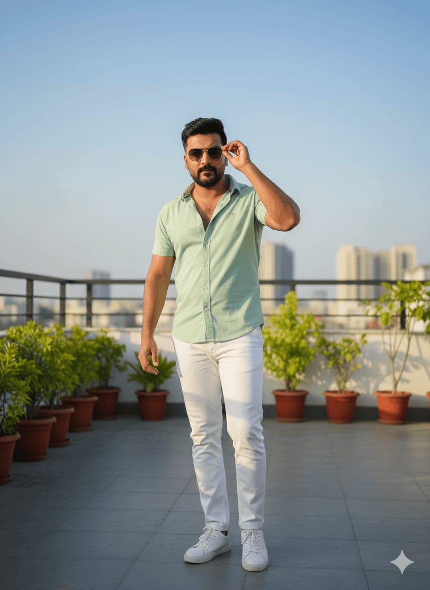 “A 4K ultra-HD, vibrant portrait of a handsome Indian boy (preserve face 100%) wearing a pastel green short-sleeve shirt, white slim-fit trousers, and white sneakers. He is standing on a modern rooftop with potted plants, warm morning sunlight, and city skyline behind. Pose: relaxed side-glance, one hand adjusting sunglasses, and wind in hair. Lighting: soft shadows and natural light. Ultra-Sharp Focus, Youthful Stylish AI Portrait, –ar 9:16.