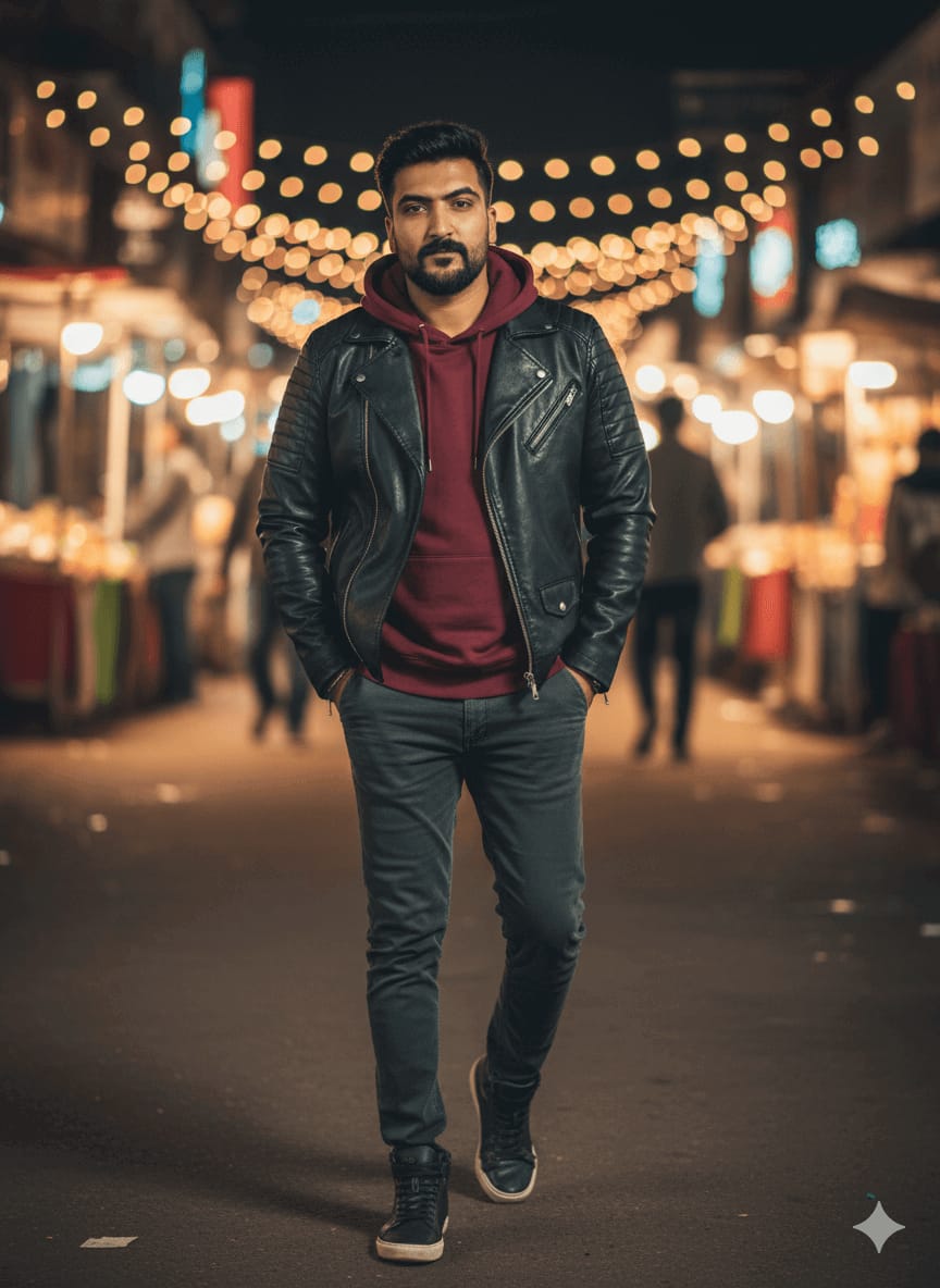 “A 4K portrait of a smart Indian boy (preserve face 100%) wearing a black fitted leather jacket over a maroon hoodie, dark grey pants, and high-top sneakers. He is walking confidently through a bustling night market with colorful lights and blurred stalls behind. Lighting: dynamic ambient lighting creating glows on skin and leather. Pose: casual hands-in-pocket pose, subtle smile, and tousled hair. 8K RAW Photo, Trendy Urban Night Vibe, Eye-Catching, –ar 9:16.
