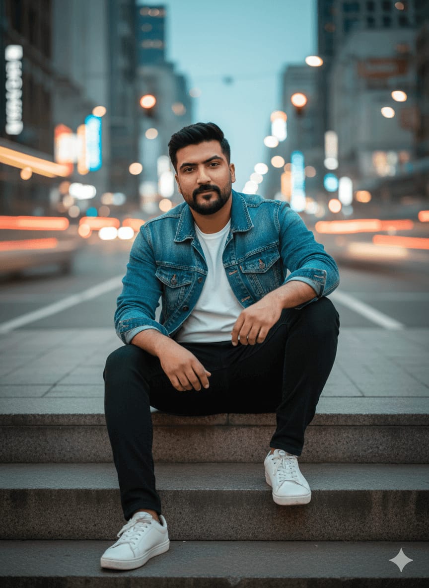 “A 4K ultra-HD portrait of a smart-looking Indian man (preserve face 100%) wearing a faded blue denim jacket over a white tee, black skinny jeans, and white sneakers. He is sitting on outdoor steps with blurred urban traffic and neon lights in the background. Lighting: urban lighting reflections and natural light. Pose: relaxed posture with one hand on knee and confident half-smile. High-Detail, Trendy Stylish Streetwear Vibe, –ar 9:16.
