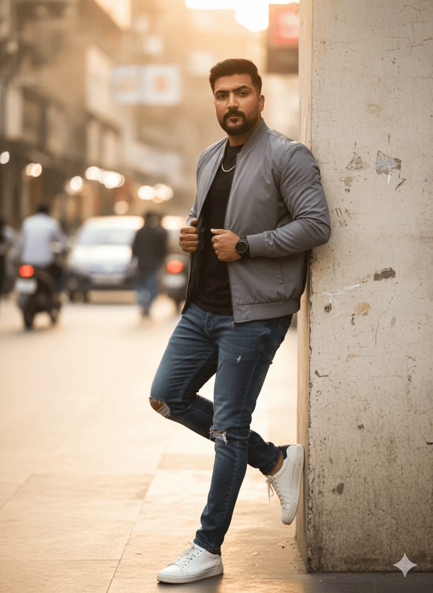 “A 4K portrait of a handsome Indian boy (preserve face 100%) wearing a grey bomber jacket over a black fitted T-shirt, paired with slim ripped jeans and white sneakers. He is leaning casually against a textured wall on an Indian metro street with soft golden hour lighting. Lighting: crisp details and natural skin tone. Pose: confident smirk, short styled hair, and subtle accessories. Ultra-Sharp Focus, Trendy Urban Look, Professional Quality, –ar 9:16.