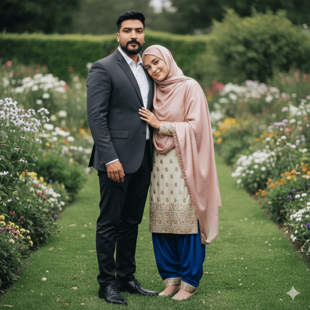 A stunning full-body portrait of a young couple (maintain reference face accuracy for both). Girl: Wearing an elegant, flowy Punjabi-style Patiala Shalwar Kameez with intricate embroidery and a soft silk dupatta draped modestly over her head. Boy: Wearing a modern fitted suit with a dark blazer and white shirt. Pose: They are standing closely in a serene outdoor garden, the girl is subtly leaning her head on the boy’s shoulder. Lighting: Soft, diffused daylight, rich fabric texture, 8K RAW Photorealistic, –ar 9:16.
