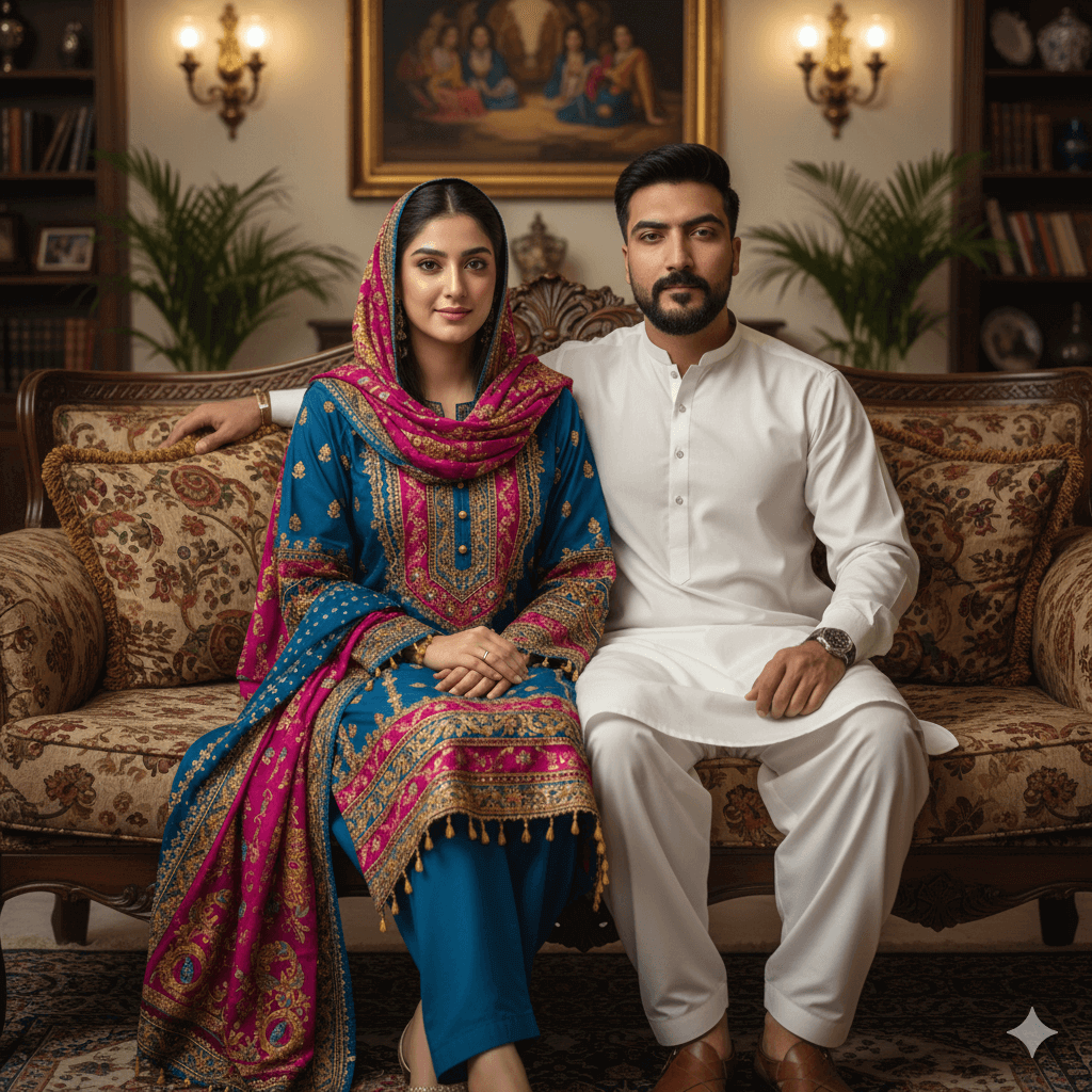 A celebratory portrait. Girl: Wearing a brightly colored, embroidered lawn shalwar kameez. Boy: Wearing a white Kurta-Pajama. Pose: Sitting side-by-side on a decorative sofa in a traditional living room setting, looking confidently at the camera. Lighting: Warm interior lighting, rich color grading, 8K UHD RAW Photo, Intricate Fabric Detail, –ar 9:16.