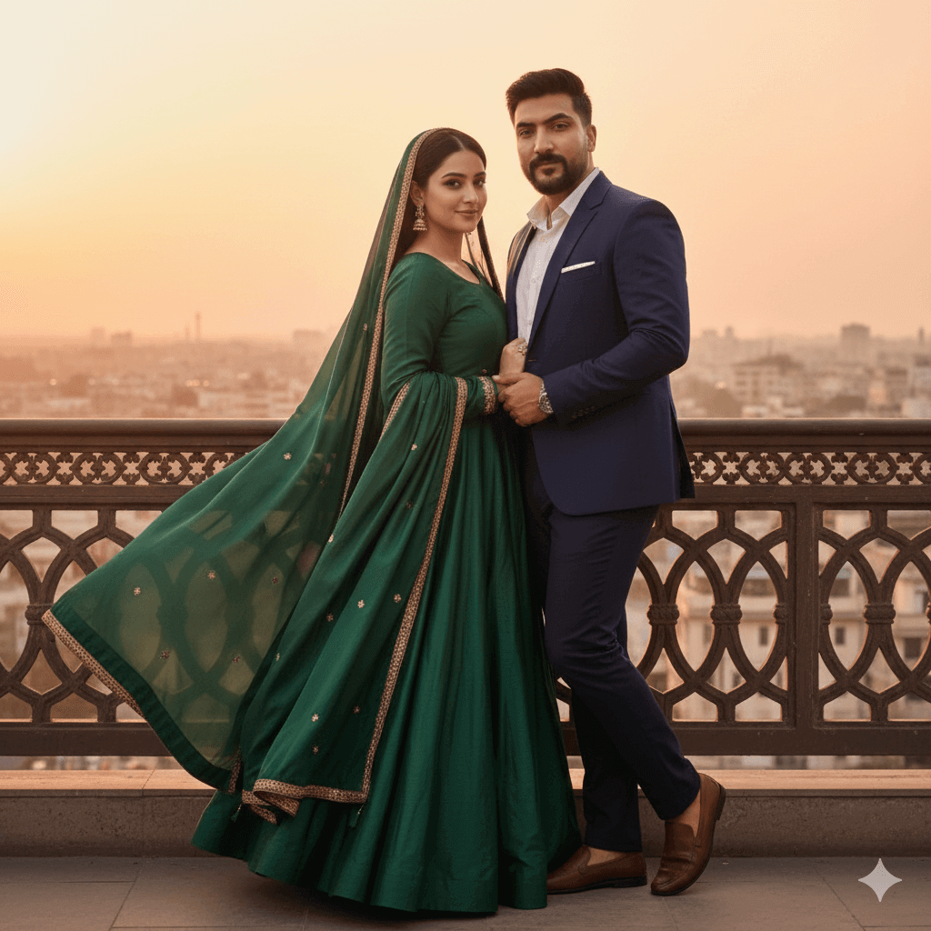 A romantic close-up mid-shot (maintain reference face accuracy for both). Girl: Wearing an elegant, floor-length silk anarkali frock with Churidaar pajamas, and a beautifully styled dupatta. Boy: Wearing a tailored navy blue blazer over smart casual trousers. Pose: Standing on a balcony at sunset, the girl is looking tenderly at the boy, who is looking straight at the camera. Lighting: Warm ‘Golden Hour’ glow, atmospheric depth, Photorealistic Skin Texture, 4K resolution, –ar 9:16.