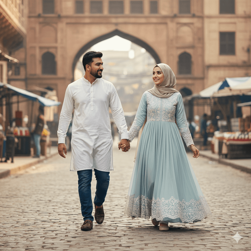 A cinematic full-body shot. Girl: Wearing a flowing, modest Anarkali frock with delicate lace work, and a matching dupatta pinned neatly on her head. Boy: Wearing a casual, yet smart, white Kurta over denim jeans. Pose: Walking hand-in-hand down a historic, cobblestone street in Lahore, blurred background. Lighting: Bright, natural diffused daylight, motion blur effect on the ground, Intricate Fabric Detail, Magazine Cover Style, –ar 9:16.