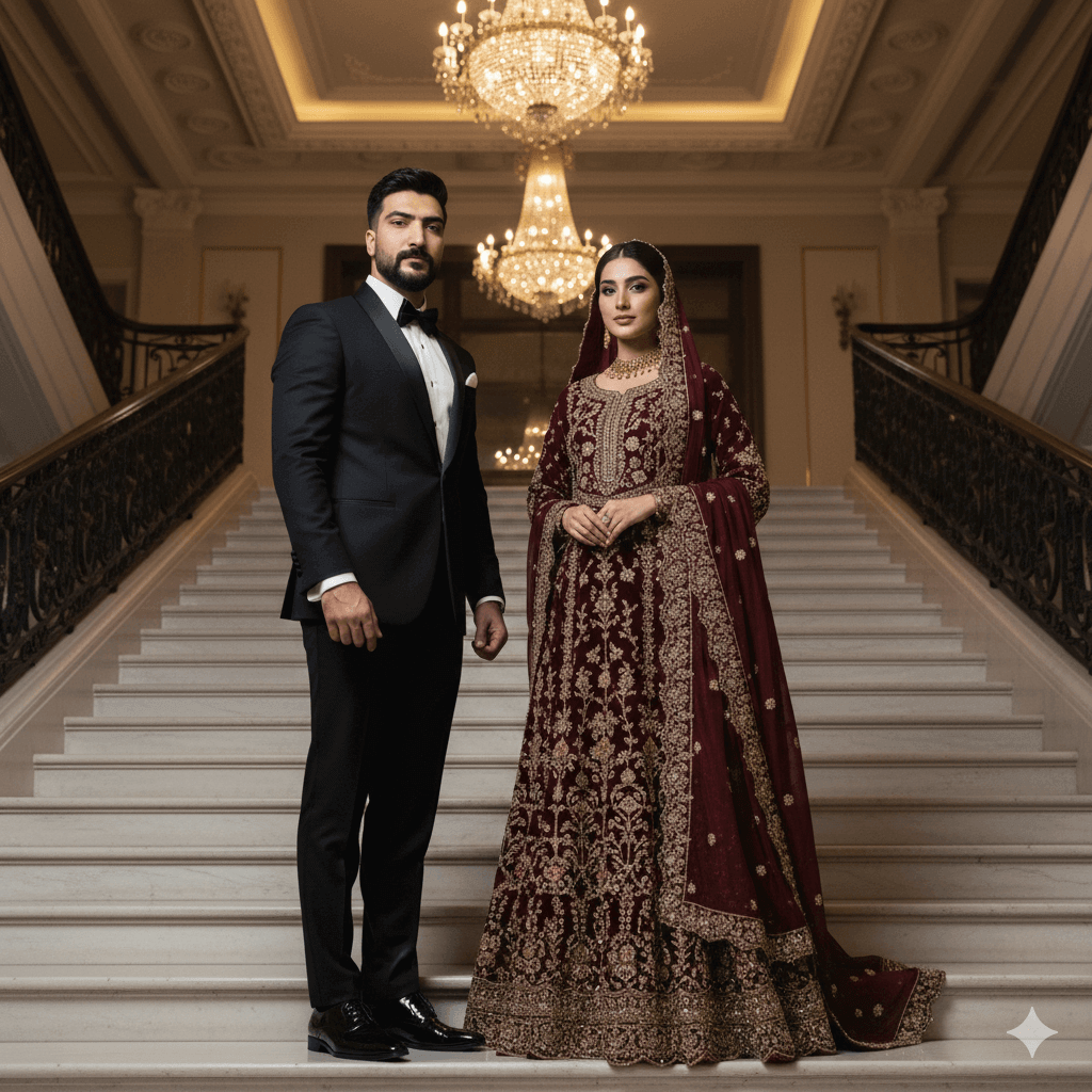 Highly stylized portrait (exact face retention required). Girl: Wearing a heavy embroidered Pakistani-style maxi dress (not revealing), with a heavy dupatta covering her head and chest. Boy: Wearing a sharp black tuxedo/suit. Pose: Standing on a grand marble staircase at a luxurious reception hall, looking poised and elegant. Lighting: Opulent interior chandelier light, deep shadows, 8K UHD RAW Photo, Masterpiece Quality, –ar 9:16.