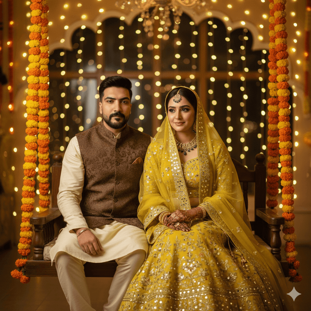 A vibrant half-body portrait. Girl: Dressed in a bright yellow and green Lehenga-Choli (modestly covered by a dupatta), hands decorated with mehndi. Boy: Wearing an embroidered Kurta-Pajama with a waistcoat. Pose: Sitting on a traditional swing surrounded by marigold flowers, both maintaining a calm, serene expression. Lighting: Warm, festive string lights glow, soft bokeh background, Ultra-Sharp Focus, Photorealistic, –ar 9:16.