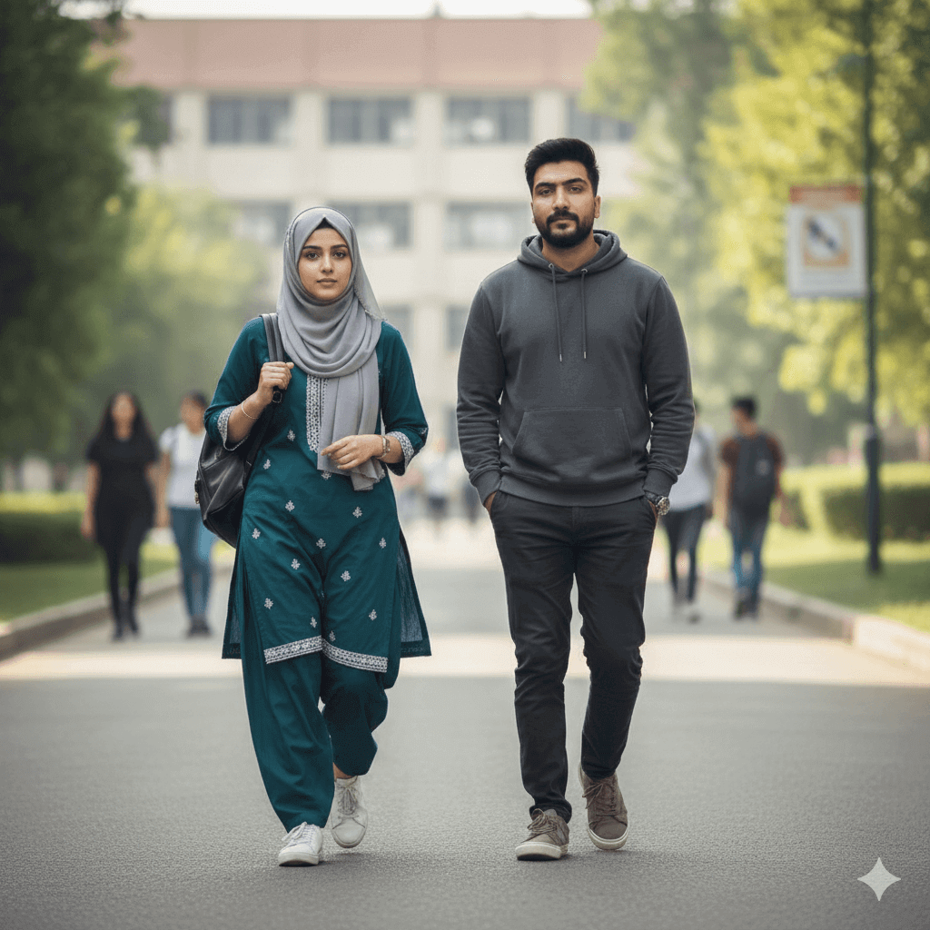 A candid street style shot. Girl: Wearing a modern, loose-fit shalwar kameez with sneakers and carrying a backpack. Boy: Wearing a hoodie and trousers. Pose: Walking quickly on a university campus path, looking forward, hands in pockets. Lighting: Bright urban daylight, slight motion blur, Photorealistic Skin Texture, no compression, –ar 9:16.