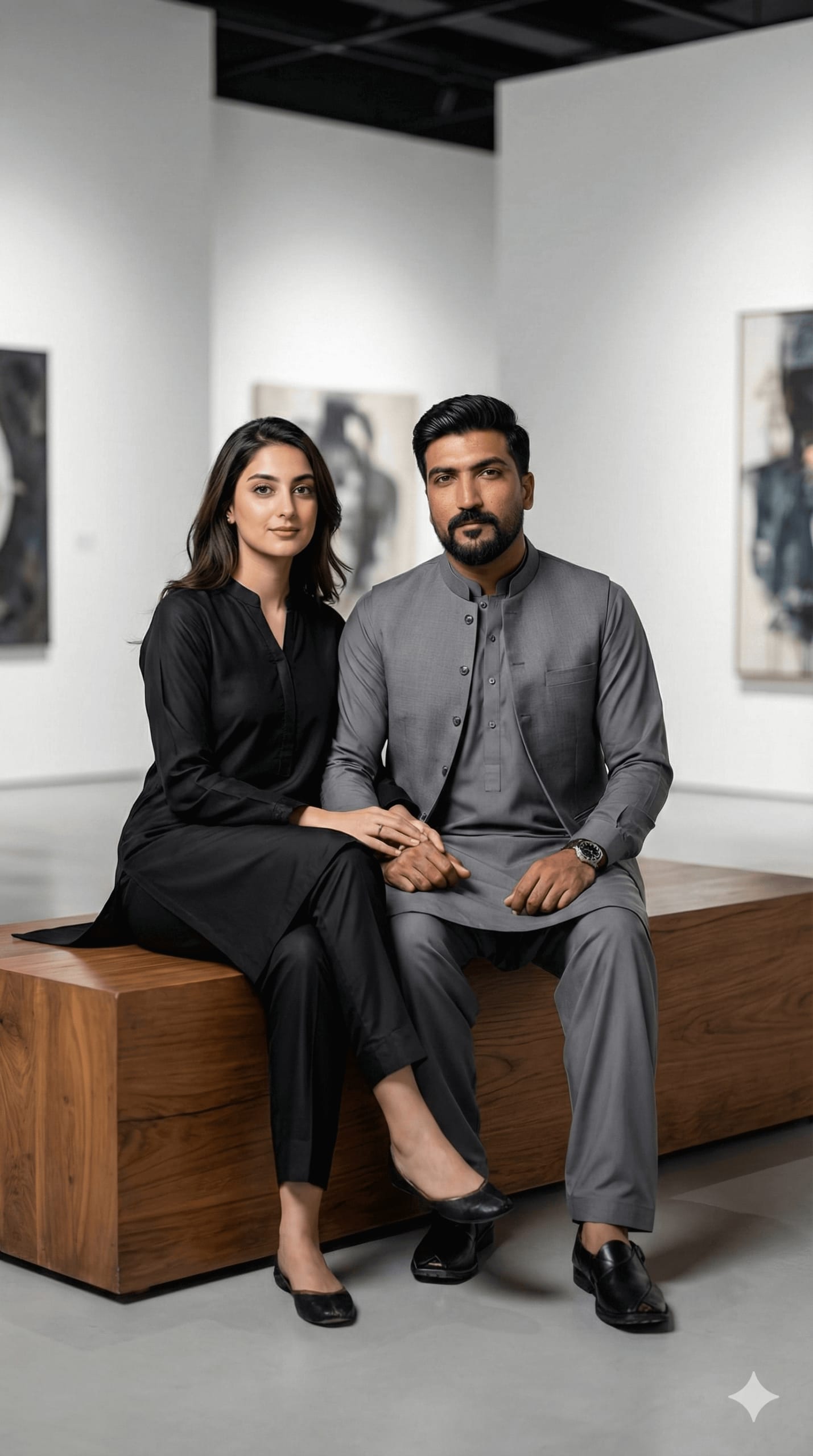 A captivating half-body portrait (same real face for the girl required). Girl: Dressed in a sophisticated, minimalist black shalwar suit with a structured kurta and sleek trousers. Boy: Wearing a modern grey Kurta-Pajama with a matching waistcoat. Pose: Sitting relaxed on a large wooden bench inside a minimalist art gallery, their hands gently touching. Lighting: High-contrast studio lighting, shallow depth of field, Ultra-Sharp Focus, Masterpiece Quality, –ar 9:16.