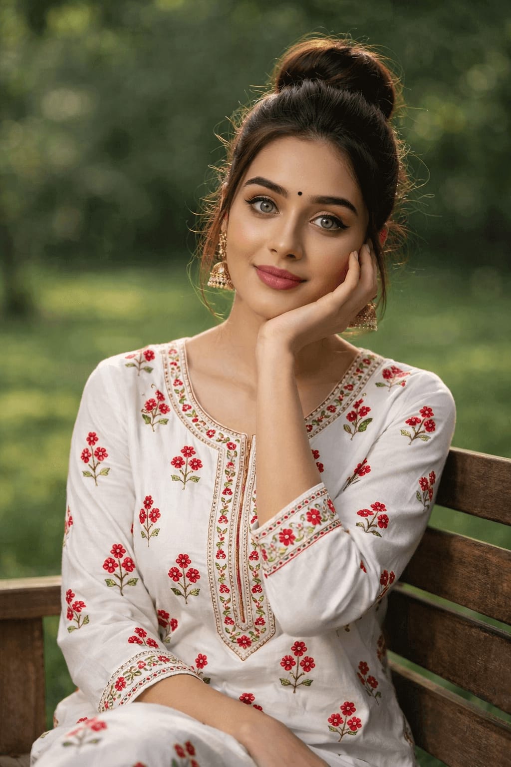 A young woman in a white embroidered kurta with red floral patterns, sitting gracefully on a wooden bench in a lush green park, soft natural light, hand gently touching her cheek, traditional gold jhumka earrings, serene expression.