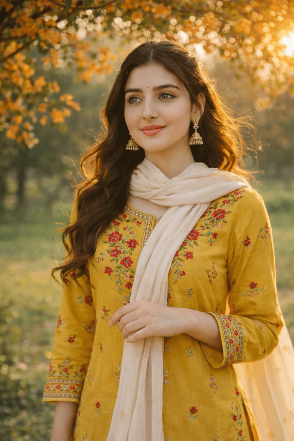 Standing under a canopy of orange blossoms in a mustard yellow kurta with red floral embroidery, dupatta tied loosely around neck, golden hour glow, slight breeze, romantic and elegant pose, soft focus nature backdrop.