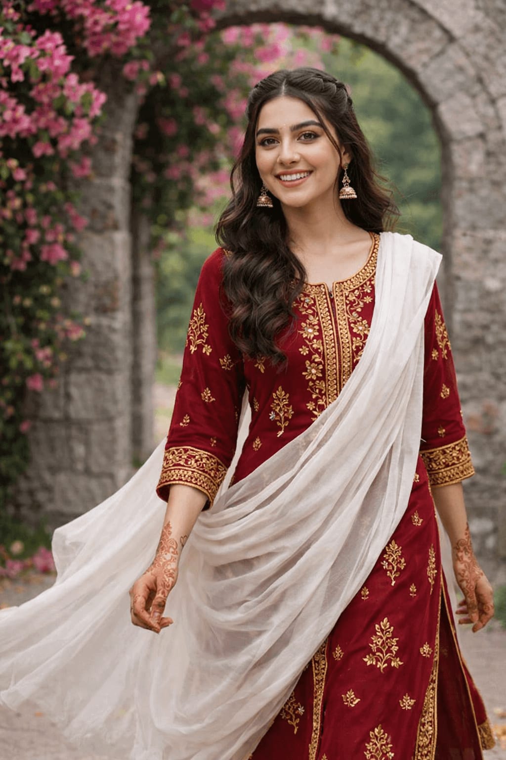 Smiling woman walking outdoors in a maroon salwar kameez with gold embroidery, draped in a flowing white dupatta, henna on hands, arched stone doorway with pink bougainvillea behind, joyful expression, soft daylight.