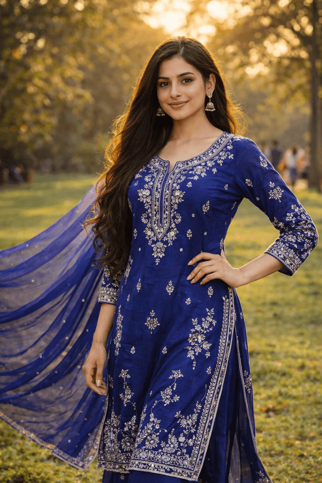 Young woman standing confidently on grass in a royal blue salwar kameez with silver embroidery, one hand on hip, matching dupatta flowing behind, golden hour sunlight filtering through trees, park background with blurred people.