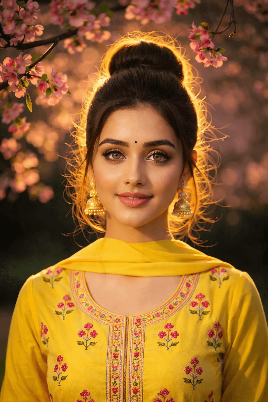 Close-up portrait of a woman in a bright yellow kurta with pink floral embroidery, hair in a high bun with glowing backlight, cherry blossoms framing her face, warm sunset glow, subtle bindi, soft makeup, serene gaze.