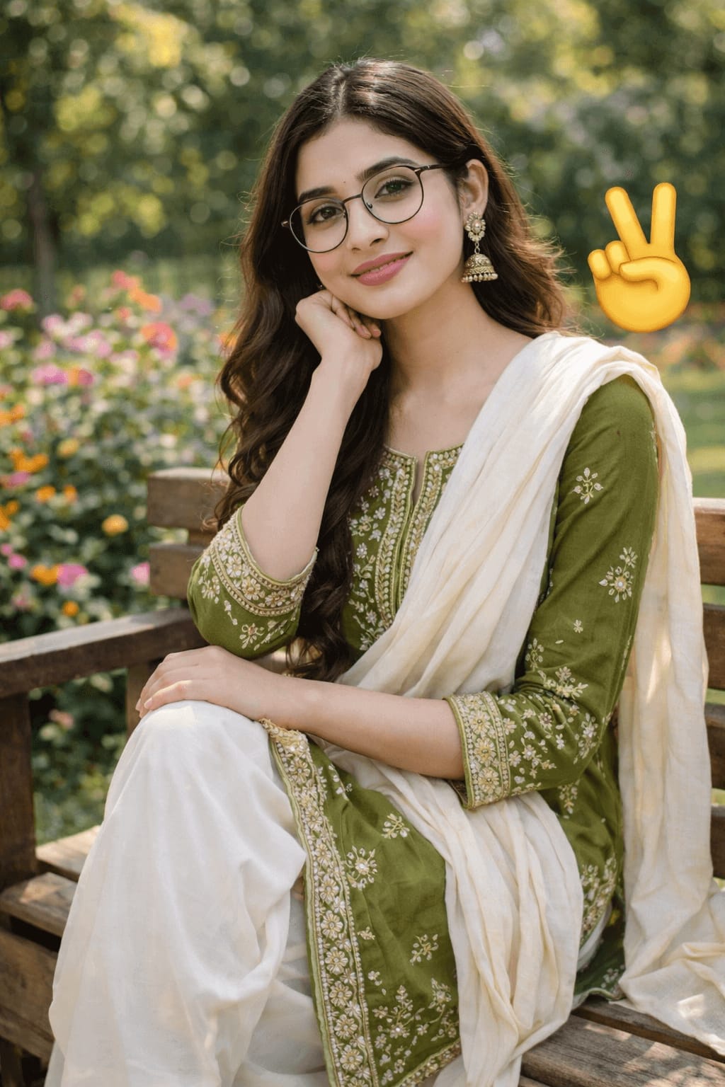 Woman sitting on a wooden bench in a vibrant garden, wearing olive green kurta with white pants, cream dupatta draped over shoulders, glasses, relaxed pose, peace sign emoji floating nearby, colorful flowers in background, sunny day.