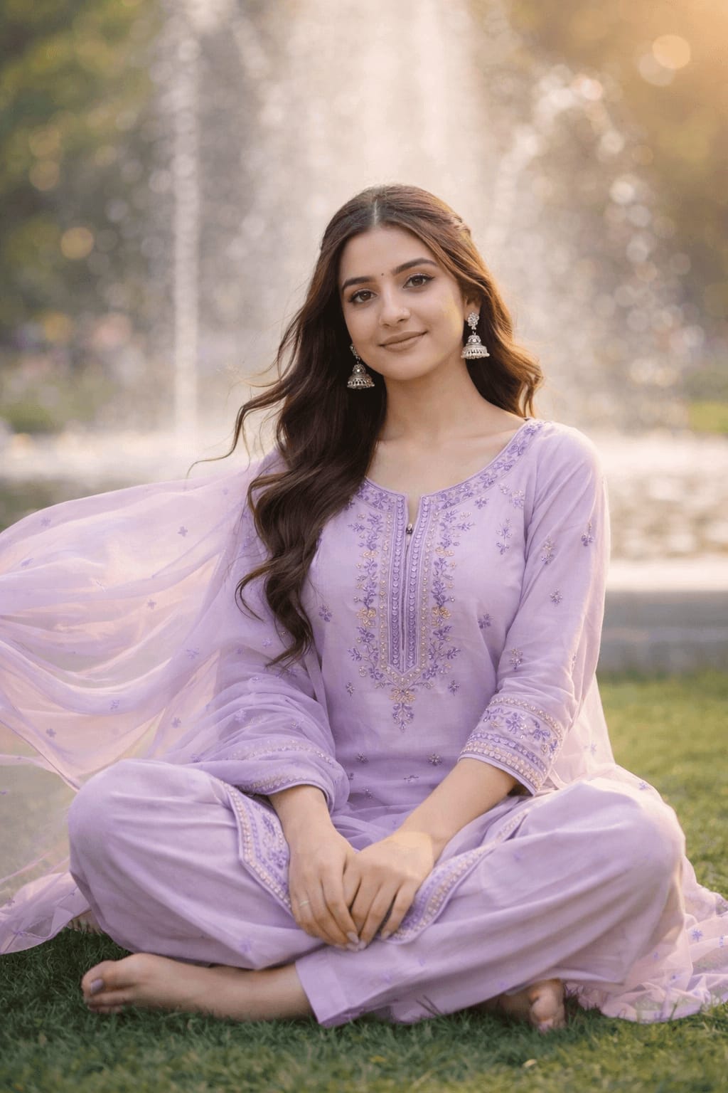 Woman in a soft lavender kurta with delicate purple embroidery, seated cross-legged on grass near a fountain, gentle breeze lifting her dupatta, pastel tones, dreamy bokeh background, calm smile.