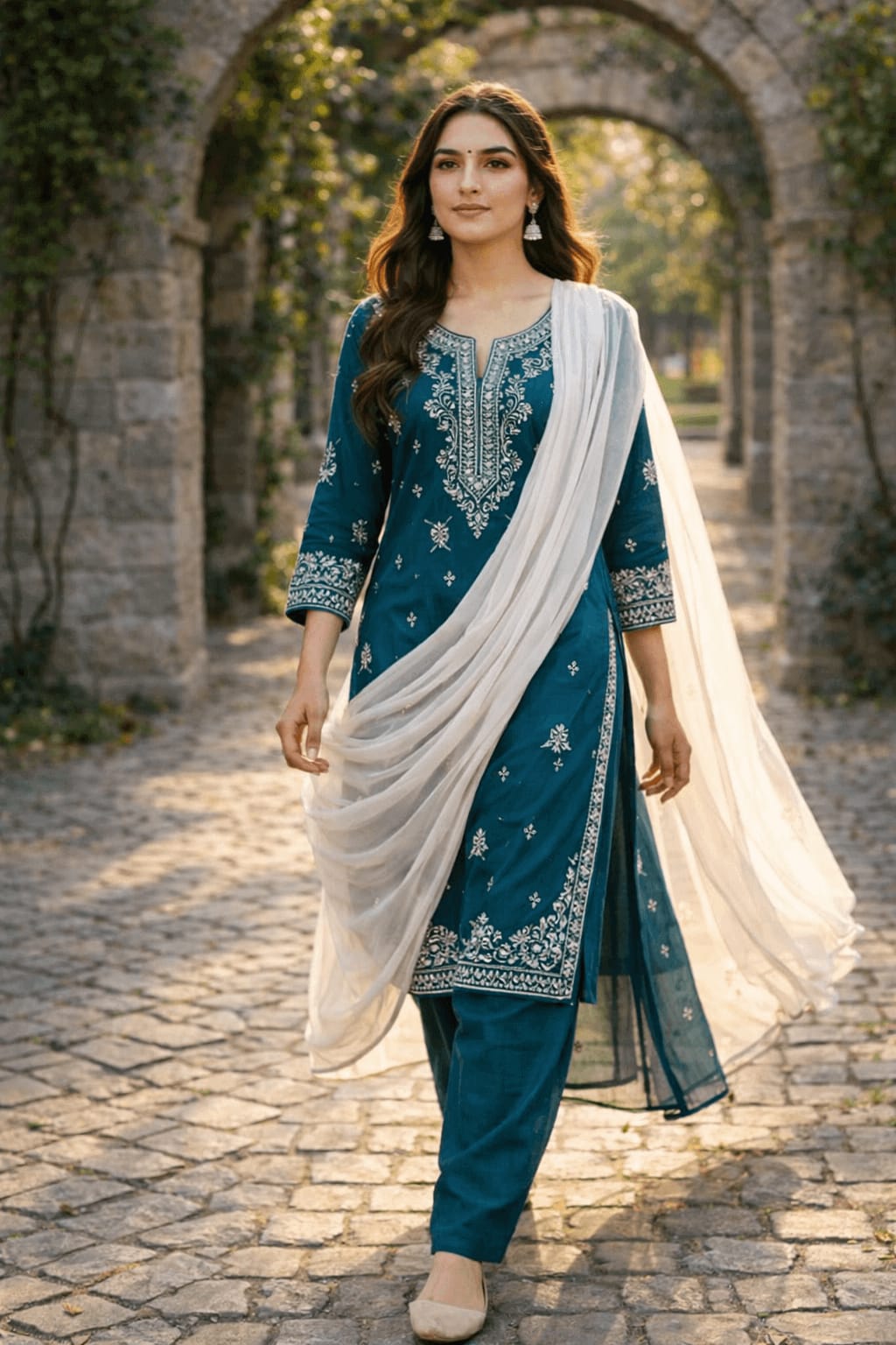 Walking confidently down a cobblestone path in a deep teal salwar kameez with silver thread work, white dupatta draped elegantly, sunlight catching the hem, arches and green vines in background, confident stride.