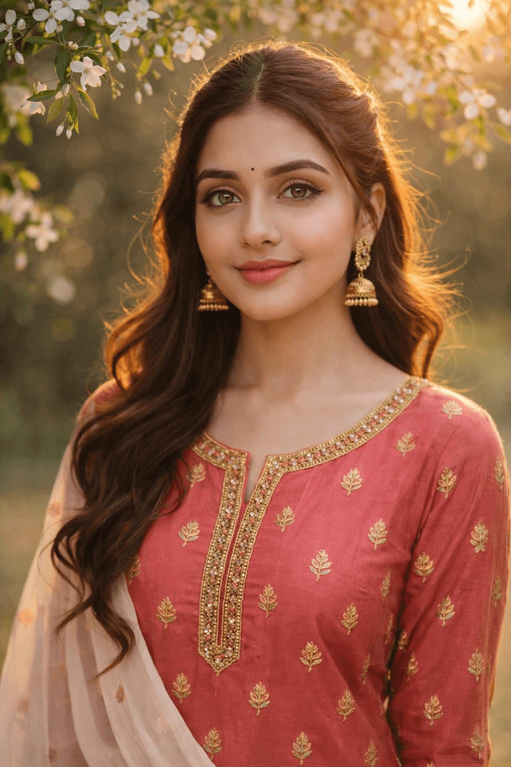Close-up of a woman in a coral pink kurta with gold leaf motifs, hair half-up, sunlight halo effect, blooming jasmine branches above, soft focus background, glowing skin, subtle jewelry.
