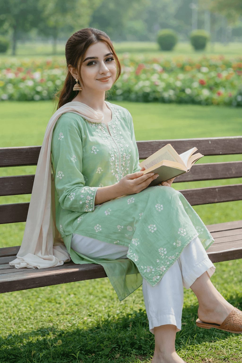 Sitting sideways on a park bench in a mint green kurta with white embroidery, legs crossed, beige sandals, holding a book, soft morning light, manicured lawn and flowerbeds behind, peaceful vibe.