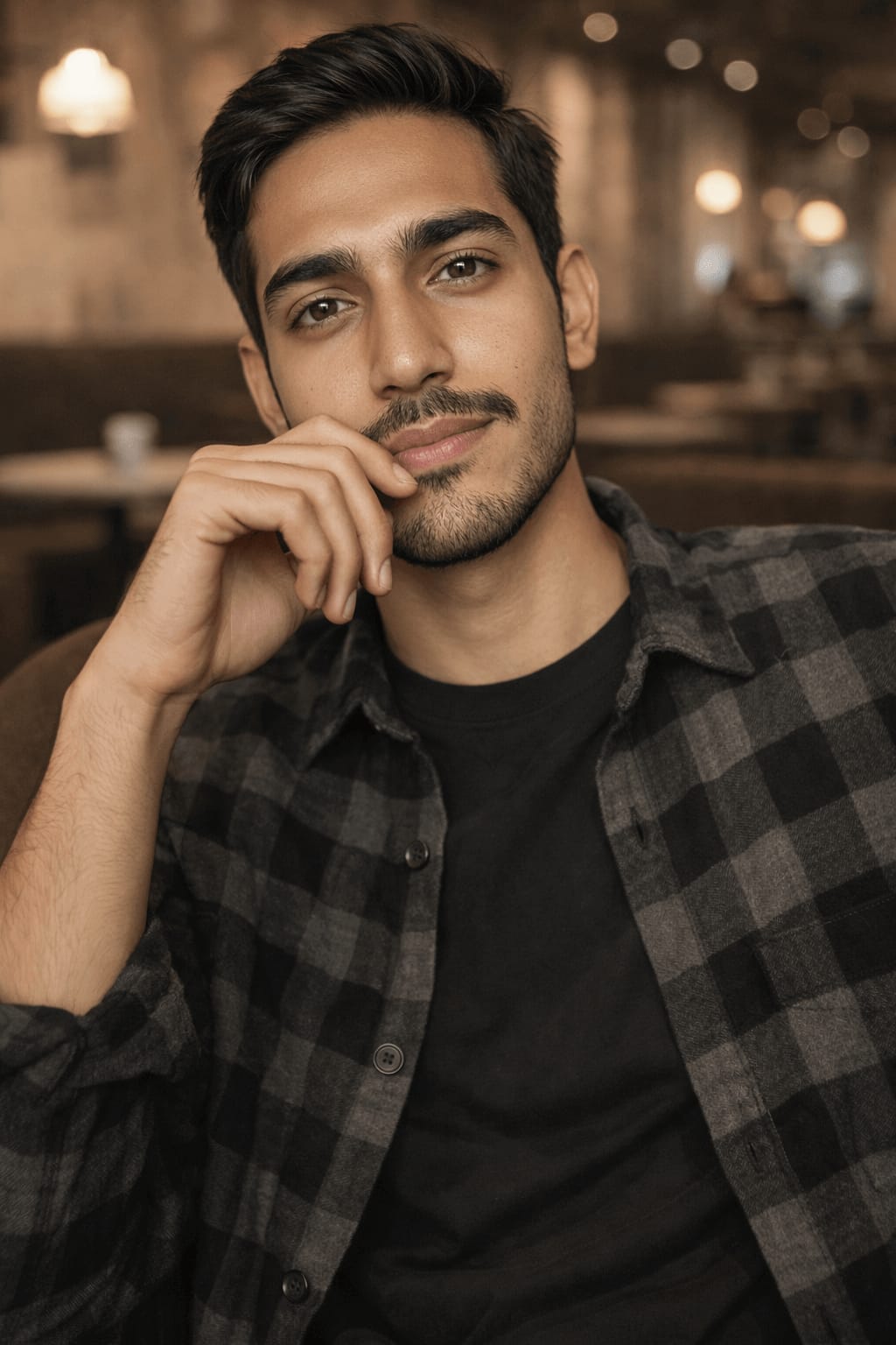 Checkered overshirt added pattern without overwhelming. The hand-near-mouth pose added thoughtfulness.