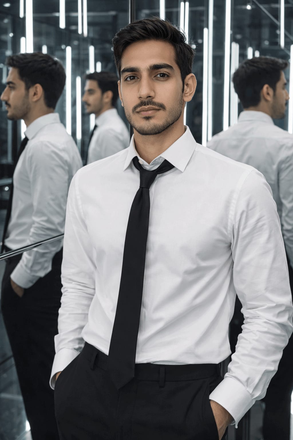 Male subject wearing fitted white dress shirt, black trousers, loose black tie.